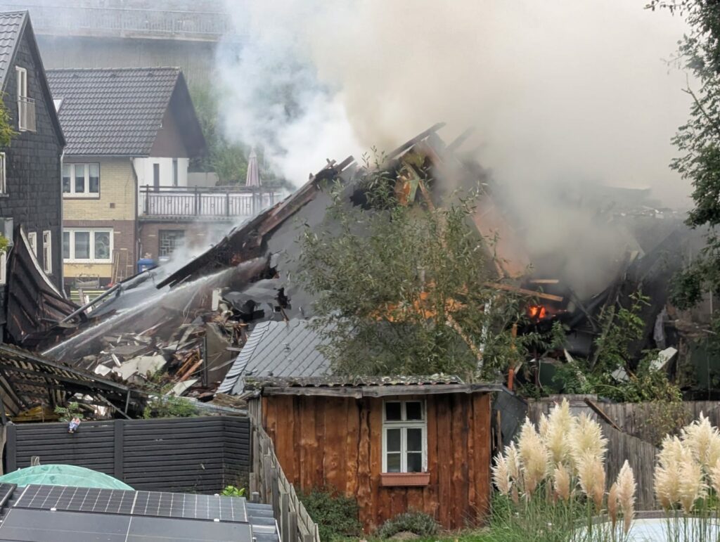 Wie bereits berichtet, kam es gegen 15:40 Uhr in der Betzdorfer Straße zu einer Explosion in einem Wohn- und Geschäftsgebäude. In der Folge stürzte das Gebäude ein und geriet in Brand.