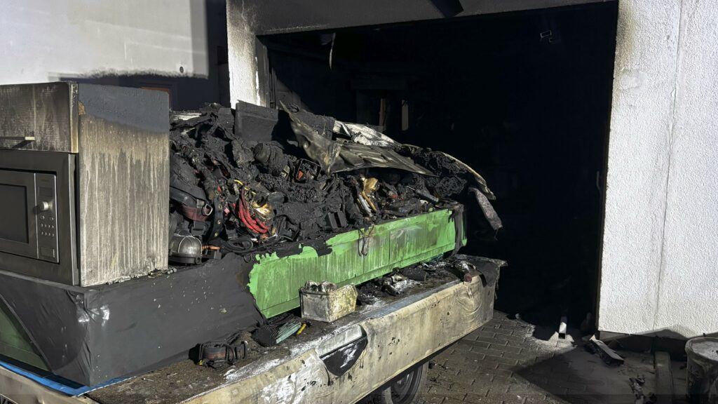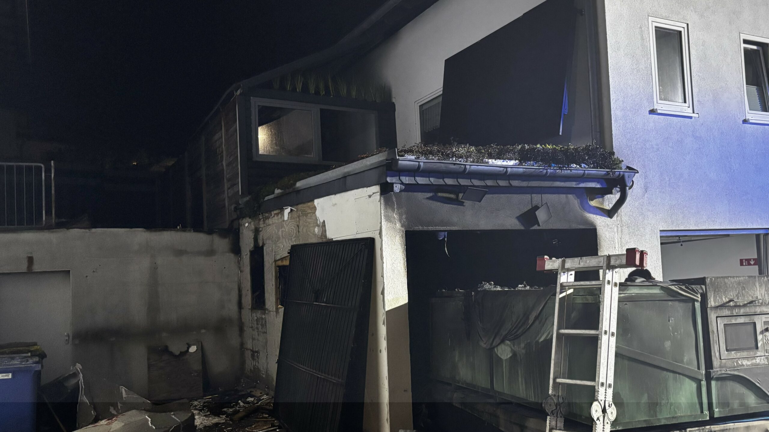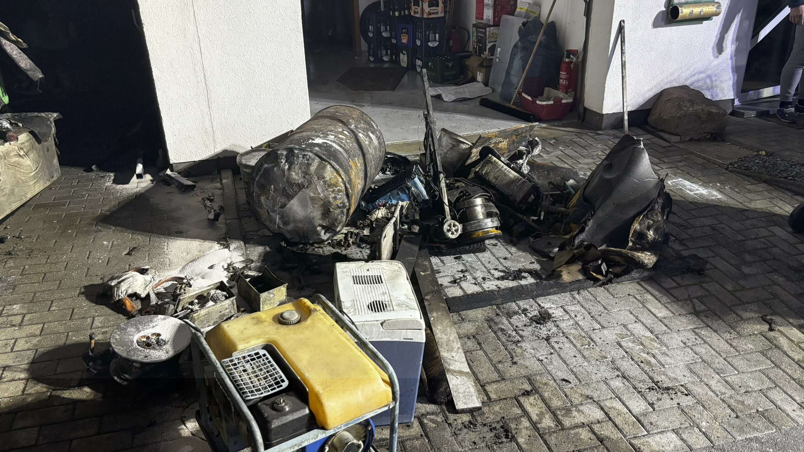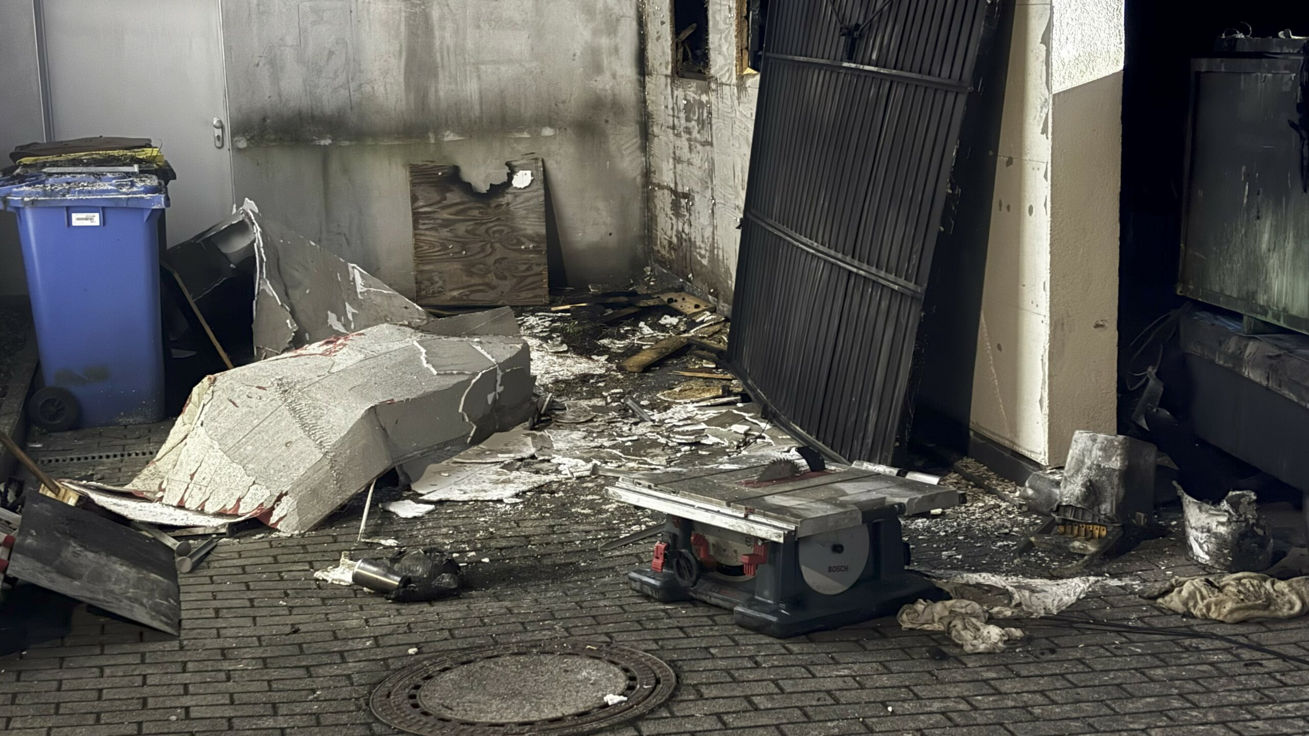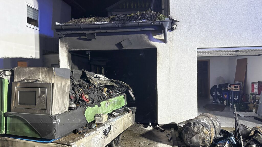 Besonders problematisch gestaltete sich die Brandbekämpfung aufgrund der baulichen Gegebenheiten: Die betroffene Garage war stark zugestellt, sodass der Zugang zu einem dahinterliegenden, unterirdischen Lagerraum zunächst nicht möglich war. Die vordere Garage bestand in Holzrahmenbauweise, während der Lagerraum massiv gebaut war. Die angrenzende Hauswand war aus Styropor-Schalsteinen gefertigt.