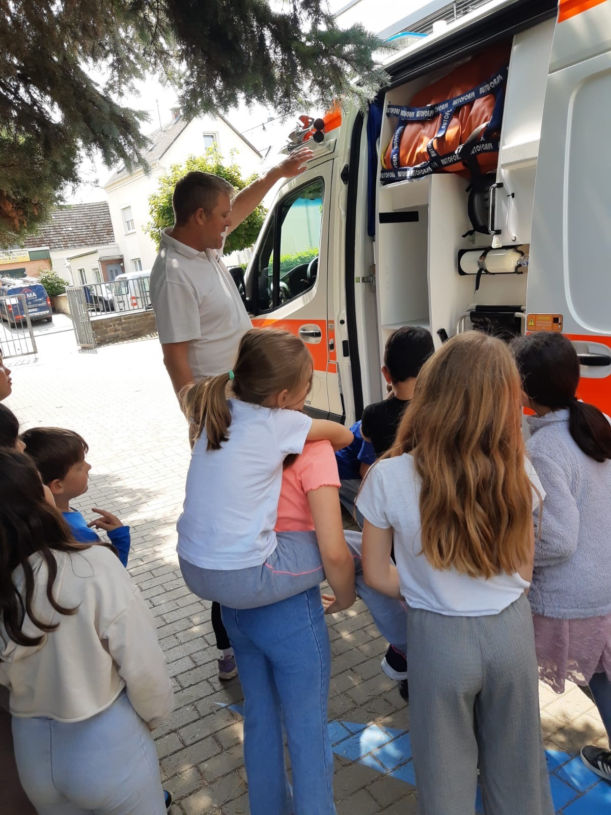 Ein besonderes Highlight war natürlich der Besuch des echten Rettungswagens, in denen die Kinder einen Blick hinter die Kulissen des Rettungsdienstes werfen durften. Vom EKG-Gerät bis zur Trage wurde alles genau inspiziert – viele Fragen wurden gestellt und mit Begeisterung beantwortet.