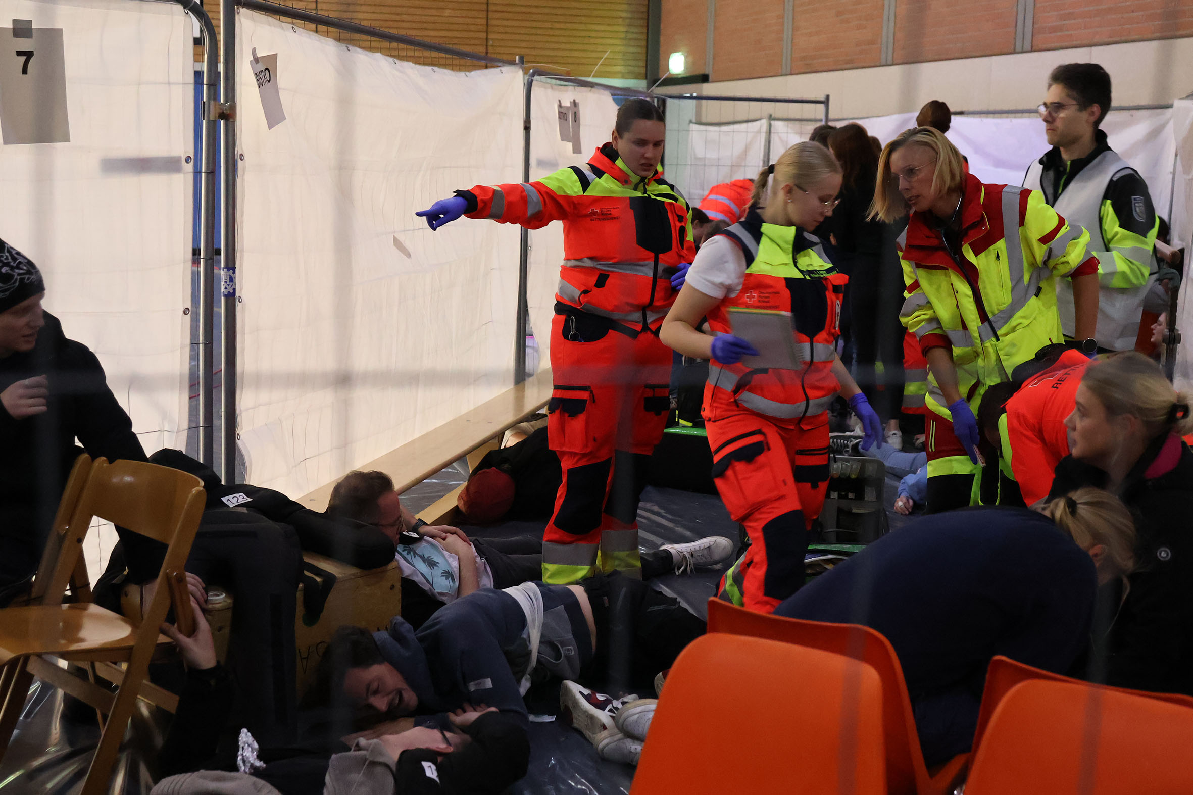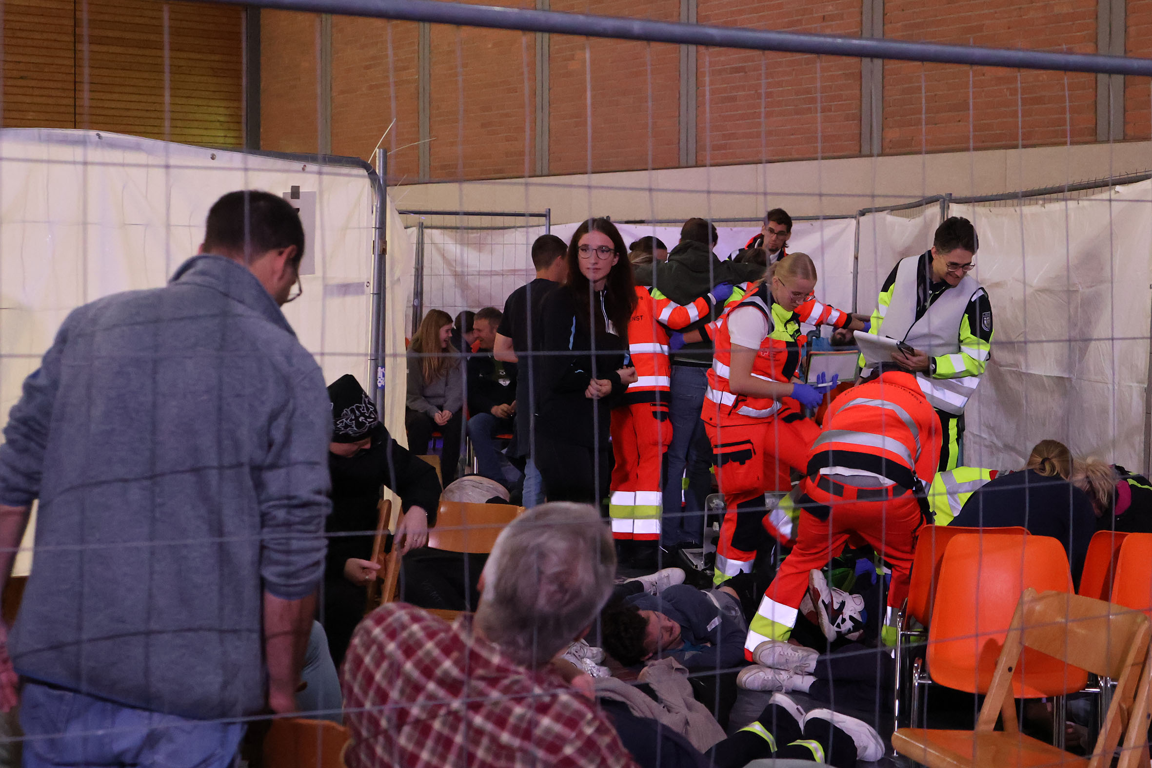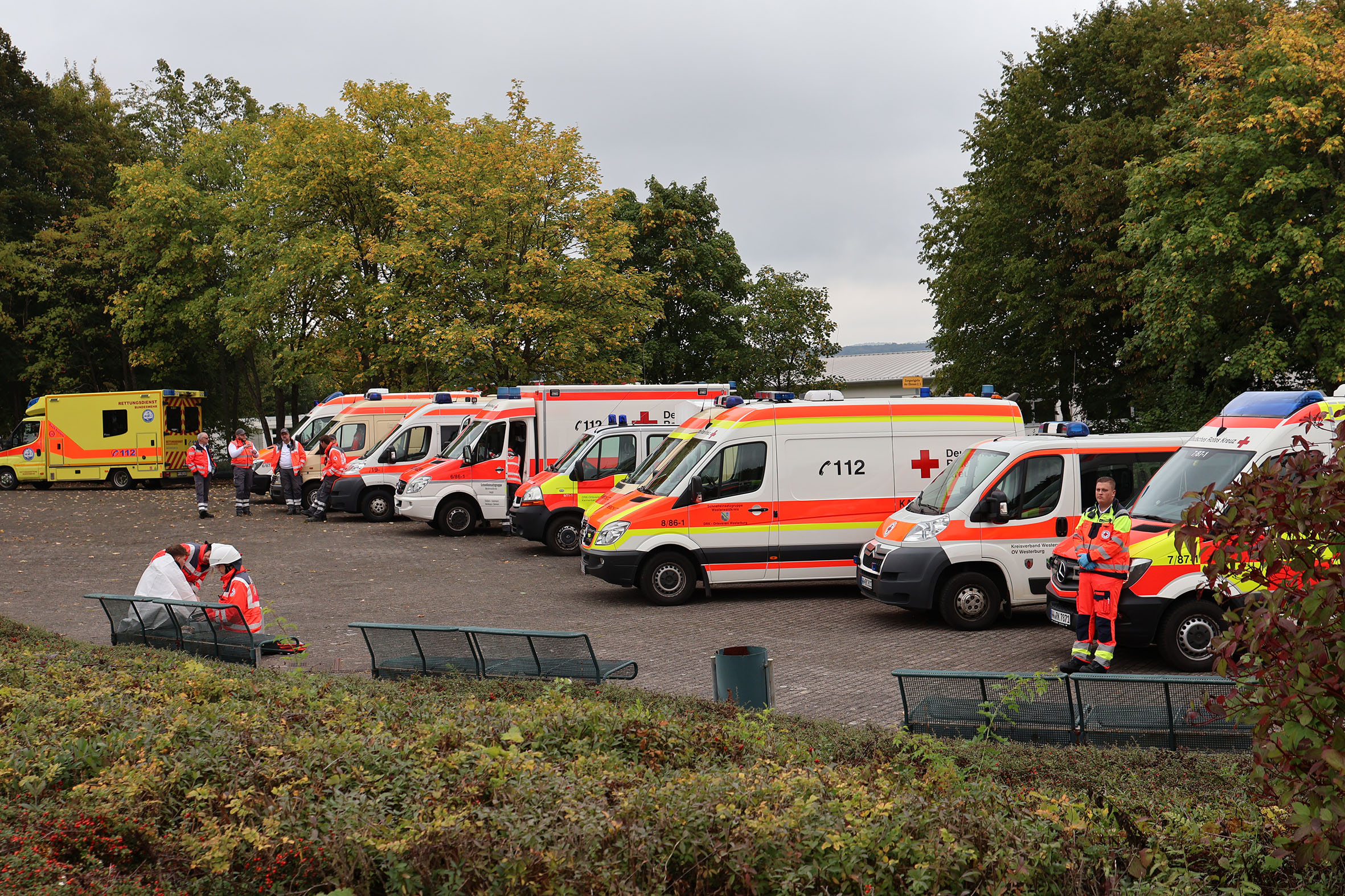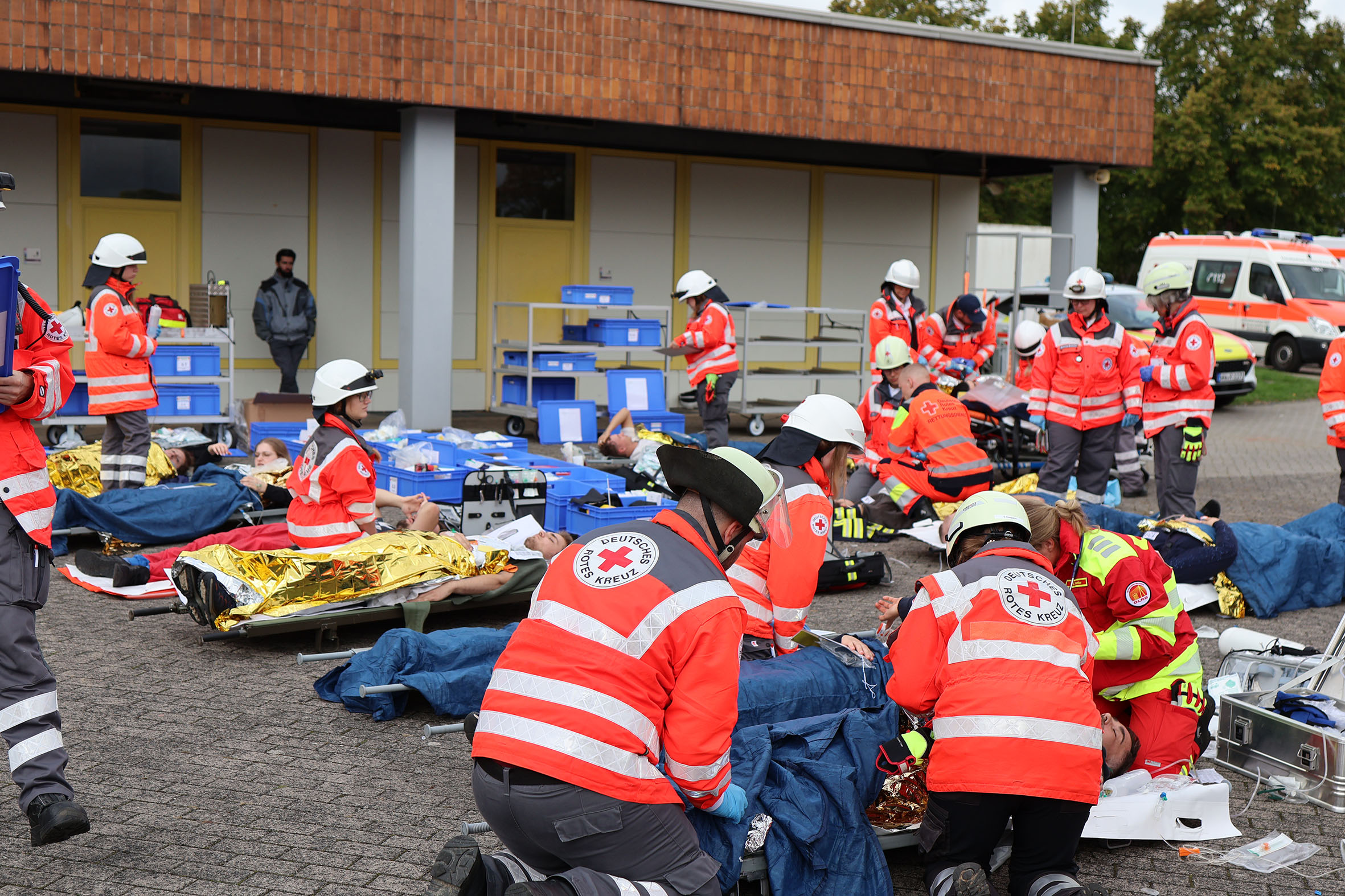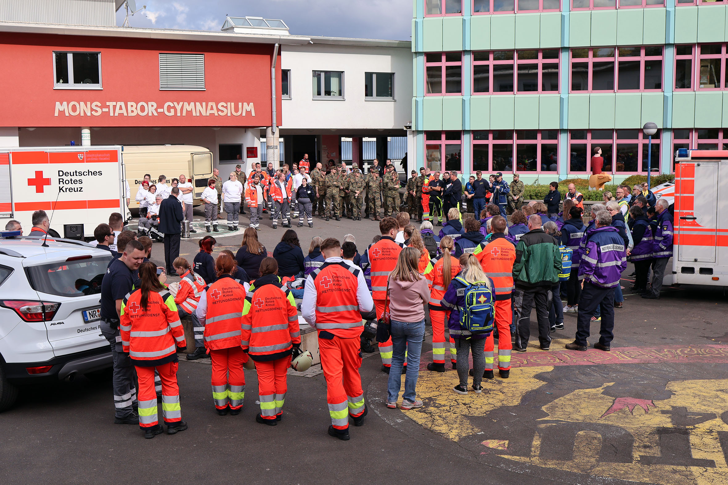 Nach der Erkundung der Einsatzstelle mussten Strukturen für Sichtung, Stabilisierung und Transport der Verletzten zum Behandlungsplatz auf dem Schulhof aufgebaut werden. Die DRK-Bereitschaft Westerwald erhielt dabei Unterstützung von den Bereitschaften der Landkreise Neuwied, Altenkirchen und Rhein-Lahn-Kreis. Später wurde auch das Sanitäts-Regiment 2 aus Rennerod mit einem mobilen Feldbehandlungsplatz hinzugezogen, um den Weitertransport der Verletzten in die Krankenhäuser Dernbach, Dierdorf, Montabaur und Selters zu organisieren. In den Kliniken setzten die Notfallpläne die Versorgung der Verletztendarsteller fort. Polizei, Verkehrssicherung und Kriminalbeamte waren ebenfalls in das Übungsszenario eingebunden, und die Notfallseelsorge betreute die Darsteller seelisch.