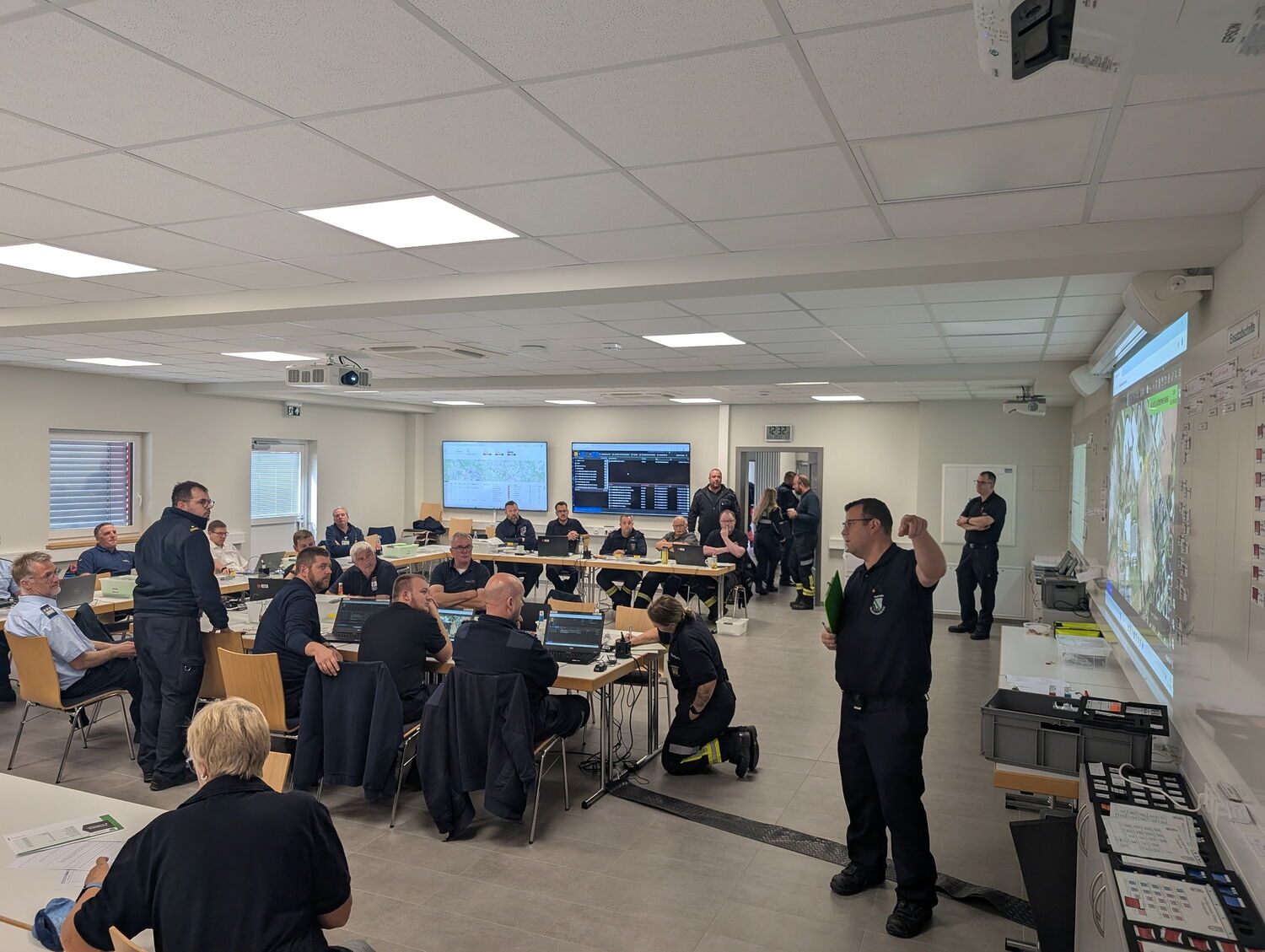 Staatssekretär Daniel Stich erläuterte vor Ort: „Neu ist, dass wir landesweit überall üben – und zwar die Ehrenamtler und die Hauptamtler gemeinsam. Seit Januar haben wir ein Landesamt mit dem bundesweit ersten Lagezentrum für Bevölkerungsschutz, in dem alle Einsätze zentral koordiniert werden. Eine solche landesweite Lage zu sehen und entsprechend einzugreifen, ist für uns neu.“